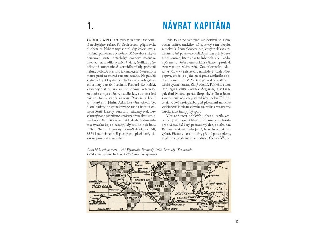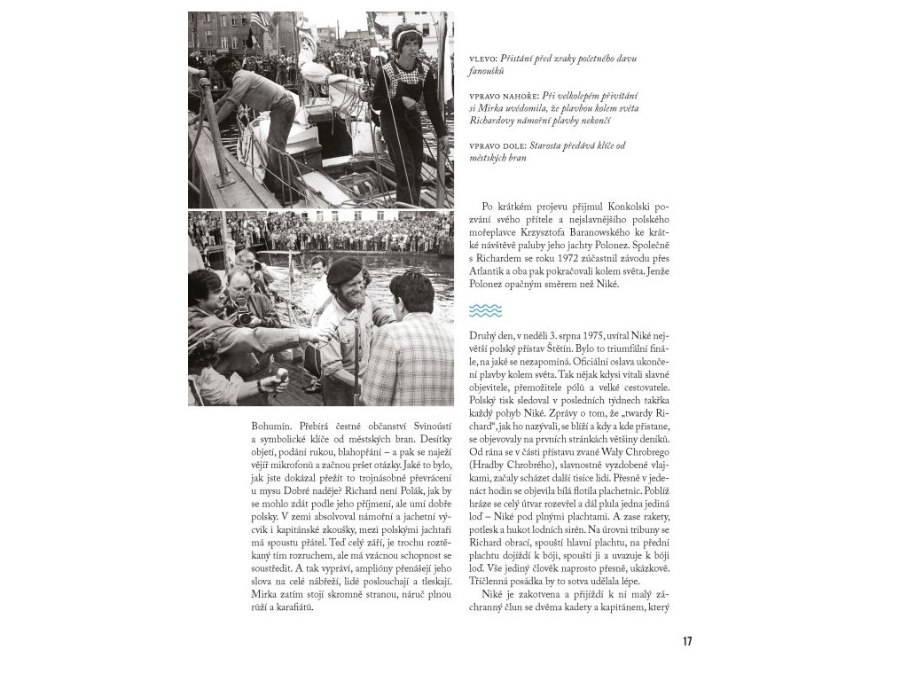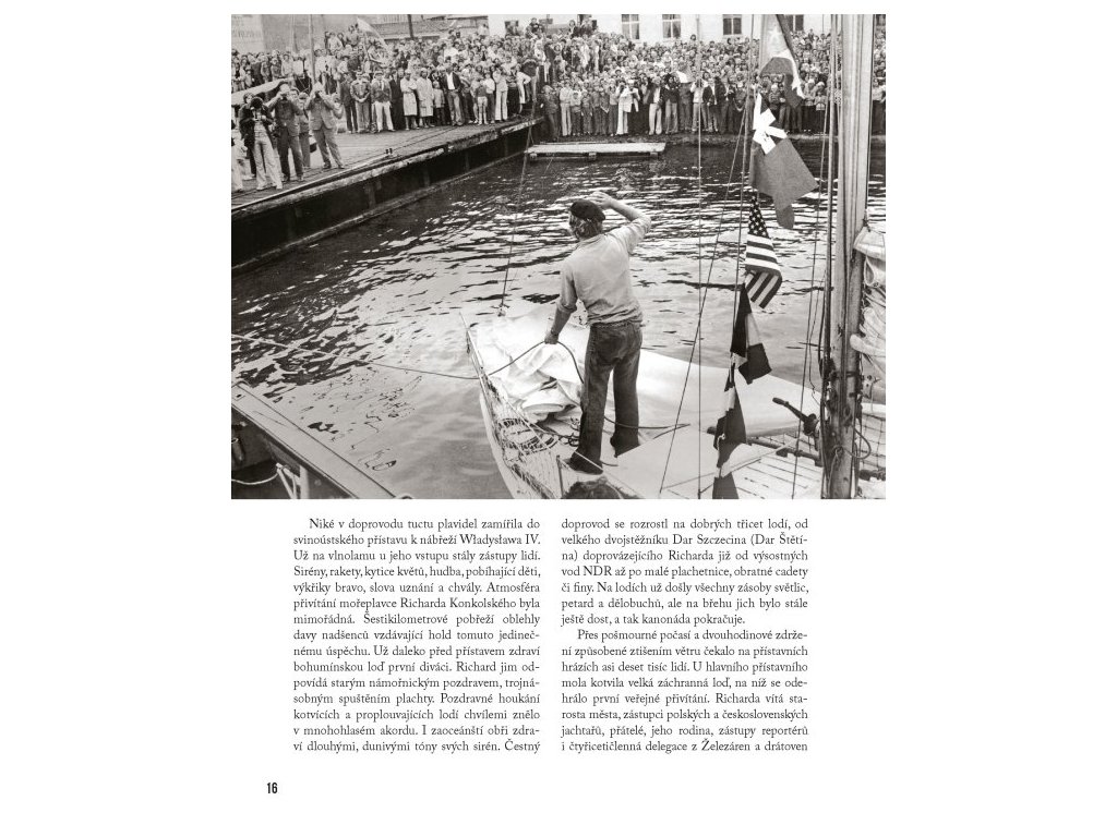 Richard Konkolski (*1943) postavil svou první loď Niké vlastníma rukama a třikrát solo obeplul zeměkouli — poprvé na druhé nejmenší lodi historie. Získal 12 světových rekordů, mnohokrát bojoval s bouřemi a překonával hranice možného. Publikace čerpá z pečlivě vedeného archivu a přináší autorizovaný a do hloubky zpracovaný portrét nejznámějšího českého mořeplavce.