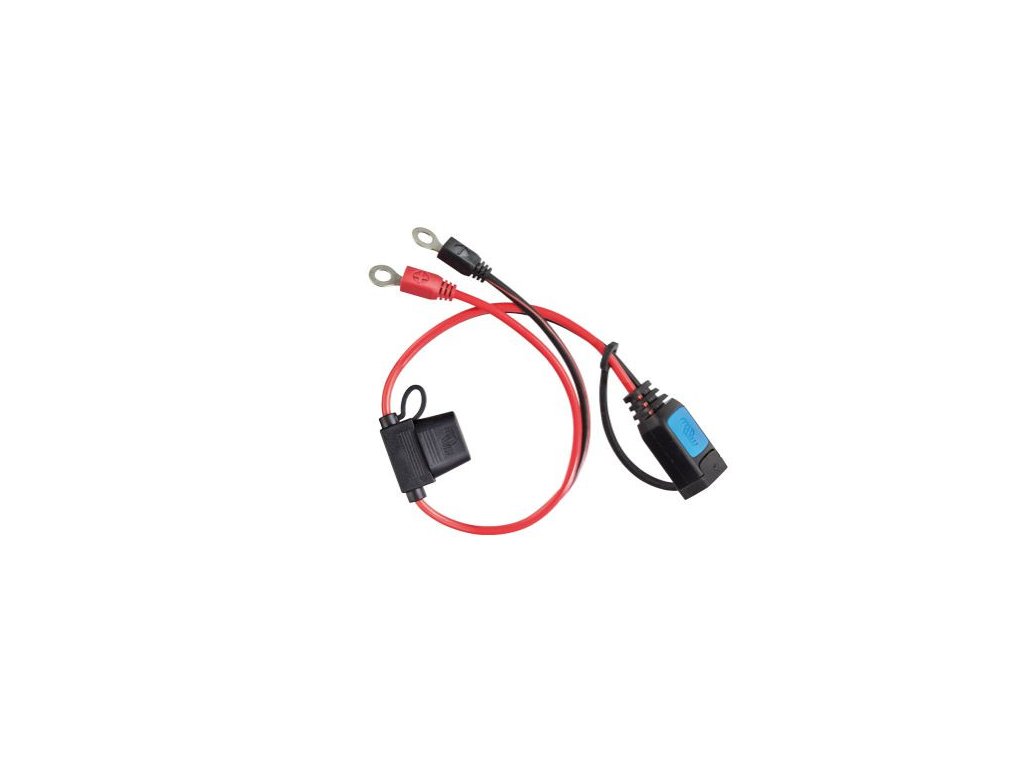 Konektor slouží k trvalému připojení k baterii pro jednoduché následné připojení nabíječů Victron Energy IP65. Oka pro šrouby M6, na kabelu je 30A nožová autopojistka.