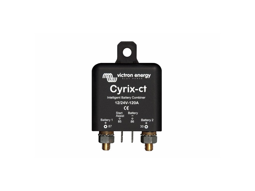 Cyrix-ct 12/24V 120A mikroprocesorem řízený bateriový propojovač (nebo také separátor či oddělovač). Relé pro dobíjení druhé baterie. Heavy Duty bateriový propojovač automaticky spojí paralelně baterie pokud napětí na baterii dosáhne nastavené úrovně (což v praxi znamená, že baterie je nabíjená) a rozpojí baterie, pokud napětí klesne pod nastavenou úroveň (baterie přestaly být dobíjeny). Cyrix také rozpojí baterie při přepětí, například když dojde k poškození nabíjení. Hlavní využití je tedy například v karavanech a lodích, kde jsou dvě baterie, jedna startovací a druhá napájecí. Baterie budou spojeny při nastartovaném motoru a rozdělené v době stání. Cyrix-ct je exelentní náhradou diodových separátorů (izolátorů). Hlavní vlastnosí je, že úbytek napětí je nulový, takže výstupní napětí alternátoru nebo nabíječe nemusí být navyšováno. Některé konkurenční separátory pracují na čistě napěťím řízené bázi, takže v případě náhlého poklesu napětí (připojení velké vybité baterie) dojde k rozpojení a to vede k selhání celého systému. Software Cyrixu 12/24 dělá více než jen spojuje a rozpojuje baterie na základě napětí. Cyrix sleduje základní napěťový trend (rostoucí nebo klesající) a obrátí předchozí stav pouze je-li trend změněn v určitém časovém úseku. 12/24 automatické nastavení Cyrix-i 12/24 automaticky provede volbu napětí Upřednostnění startovací baterie Typicky je startovací baterie připojena přímo k alternátoru. Napájecí baterie (baterie pro napájení elektrických spotřebičů ve voze, karavanu, či lodi) je spojována se startovací pomocí Cyrix-i 12/24. Jakmile Cyrix-i rozpozná, že napětí na startovací baterii dosáhlo potřebné úrovně, sepne se a tím dojde ke spojení obou baterií a jejich nabíjení alternátorem. Oboustranné měření napětí Cyrix měří napětí na obou bateriích. Pokud dojde k dobíjení napájecí baterie (například v kempu nebo marině), pak dojde také ke spojení se startovací baterií a jsou dobíjeny obě. Aby se předešlo nenadálým situacím při montáži, nebo je-li jedna baterie odpojena, Cyrix se nesepne, pokud má jedna z baterií nižší napětí než 2V (12V baterie), nebo 4V (24V baterie) Paralelní spojení v případě nouze (pomoc při startu) Cyrix může být spuštěn-sepnut tlačítkem (není součástí zařízení) automaticky na dobu 30s od sepnutí tlačítka, nebo lze provést zapojení, kdy baterie jsou spojeny po celou dobu sepnutí tlačítka. Obojí se může využít k dosažení většího startovacího výkonu baterie. Teplotní ochrana Cyrix-ct obsahuje zabudovanou teplotní ochranu. Stáhněte si k produktu Datasheet | Manuál TECHNICKÉ PARAMETRY Trvalý proud :120A Maximální proud (5s): 180A Vstupní napětí: 0-36VDC Spínací napětí (pro 24V systém jsou hodnoty dvojnásobné) Trvale rozpojeno: <13V Spojovací napětí (spoždění ca 10min): 13~13,2V Spojovací napětí (spoždění ca 5min): 13,2~13,4V Spojovací napětí (spoždění ca 1min): 13,4~13,6V Spojovací napětí (spoždění ca 4s): 13,6~13,8V Rozpínací napětí Rozpojeno: >16V (přepětí) Trvale spojeno: >12.8V Rozpojovací napětí (spoždění ca 3min): 12,4~12,8V Rozpojovací napětí (spoždění ca 30s): 12,2~12,4V Rozpojovací napětí (spoždění ca 10s): 12,0~12,2V Rozpojovací napětí (spoždění ca 1s): 11,0~12,0V Rozpojovací napětí (spoždění ca 0s): <11V Odpojení při přepětí: 16 / 32V Spotřeba v rozepnutém stavu: 4mA Spotřeba při sepnutém stavu: 12V 220mA, 24V 120mA Krytí: IP54 Rozměry: 46/46/80mm, 0,1kg