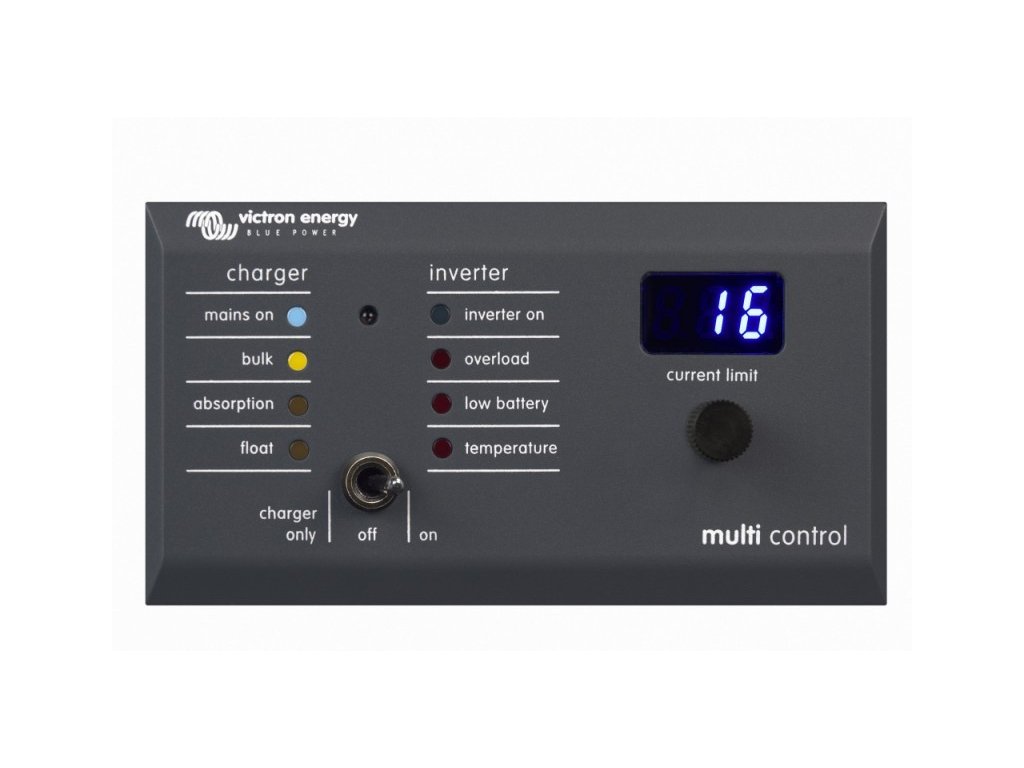 Digitální multifunkční ovládací panel GX Digital Multi Control Panel GX (DMC) je určen pro použití s měniči MultiPlus a Quattro a to jak pro samostanou jednotku, tak i pro paralelní spojení nebo 2-3f zapojení. Podporuje jak VE.Bus tak i zařízení bez VE.Bus. Zapojení je jednoduché a to prostřednictvím RJ45UTP kabelu (naleznete v příslušenstí meničů). Ovládací panel slouží k zobrazení stavu měniče, k vypnutí/zapnutí, přepnutí na nabíječ, nastavení proudu "ze břehu" (maximální proud AC vstupu, až pro 4 AC vstupy nezávisle), nastavení proudu generátoru (pro Quattro). Jas LED podsvícení se mění automaticky dle vnějšího světla. Digitální multifunkční ovládací panel GX je týž jako předchozí verze, ale má nový design. Zvláštní výhodou tohoto panelu je jeho snadná montáž: v sadě obsažený montážní rámeček umožňuje, aby si uživatel panel namontoval buď zepředu, nebo zezadu. Díky montážnímu rámečku již nebudou vidět montážní otvory. Skříň panelu GX je vyrobena z plastu, díky čemuž je panel lehčí a navíc má moderní vzhled. Pro připojení DMC k měniči Multiplus nebo Quattro je třeba běžný nekřížený RJ UTP45 kabel, který není součástí dodávky. Rozměry: 65x120x40 mm manuál EN