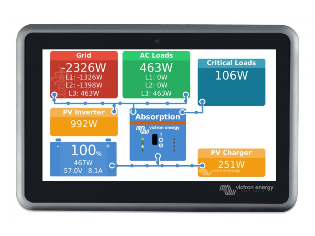 EKRANO GX je komunikační centrum pro produkty Victron Energy, které umožňuje, abyste mohli solární systém bezpečně spravovat a kontrolovat odkudkoliv, a maximalizovat jeho výkon. Jednoduše se připojíte přes náš portál na dálkové ovládání Victron Remote Management (VRM), nebo získejte přímý přístup prostřednictvím velkého integorvaného displeje (MFD) nebo naší aplikace VictronConnect díky jejím možnostem připojení přes Bluetooth, nebo prostřednictvím vestavěného přístupového bodu WiFi. Ekrano GX je také nástupcem zařízení Color Control GX. Tato novinka v řadě GX spojuje všechny nejlepší charakteristiky konektivity a představuje inteligentní řešení pro energetické systémy ve zcela novém světle. Dokonalé monitorování a kontrola Okamžitě sledujte stav nabití baterie, spotřebu energie, získávání energie z FV, generátoru a sítě nebo kontrolujte hladinu v nádrži a naměřené teploty. Snadno ovládejte omezení vstupního proudu pobřežního napájení, (automatické) spuštění/vypnutí generátoru (generátorů) nebo změňte jakékoli nastavení pro optimalizaci systému. Sledujte výstrahy, provádějte diagnostické kontroly a řešte problémy na dálku. Ekrano GX promění jakýkoli náročný úkol v oblasti napájení v bezproblémový zážitek. Rozšiřte svůj pohled Integrovaný 7palcový dotykový displej poskytuje okamžitý přehled o vašem systému a umožňuje bleskurychle upravit nastavení. Jeho mimořádně tenký vodotěsný design nabízí velkou flexibilitu při sestavování přehledné a čisté přístrojové desky. Dotykovou funkci lze vypnout (nebo povolit) pomocí zapuštěného tlačítka na zadní straně, aby se zabránilo neoprávněnému použití. Jednoduchá montáž Zařízení Ekrano GX je optimalizováno pro zapuštěnou montáž do panelu nebo do slepého otvoru a je dodáváno s veškerým potřebným montážním materiálem. Šroubovací svorkovnice udržují vše bezpečně na svém místě. Základní parametry:Napájení: 8-70 V DCPočet VE.Direct portů: 3 (maximálně až 25 zařízení)VE.Bus: Ano 2x RJ45 konektoryVE.CAN 1: ano izolovanýVE.CAN 2: ano neizolovaný USB: Ano, 2xEthernet: 10/100 RJ45 zásuvkaWifi: Ano zabudovanáBluetooth Smart: AnoMikro SD podpora karet: Ano SDHC max 32GBBMS-CAN port: ANOProgramovatelné relé: 2x NO/NC2 vstupy pro odporové měření teploty3 vstupy pro měření hladiny2 digitální vstupy Displej: 1024x600 pixelů, automatické a nastavitelné stmívání (časovač, ručně nebo senzorem)Tlačítko vypnutí zapnutí: AnoRozměry: 124x187x29,8 mmKrytí proti vodě: předek IP54, zadek IP21