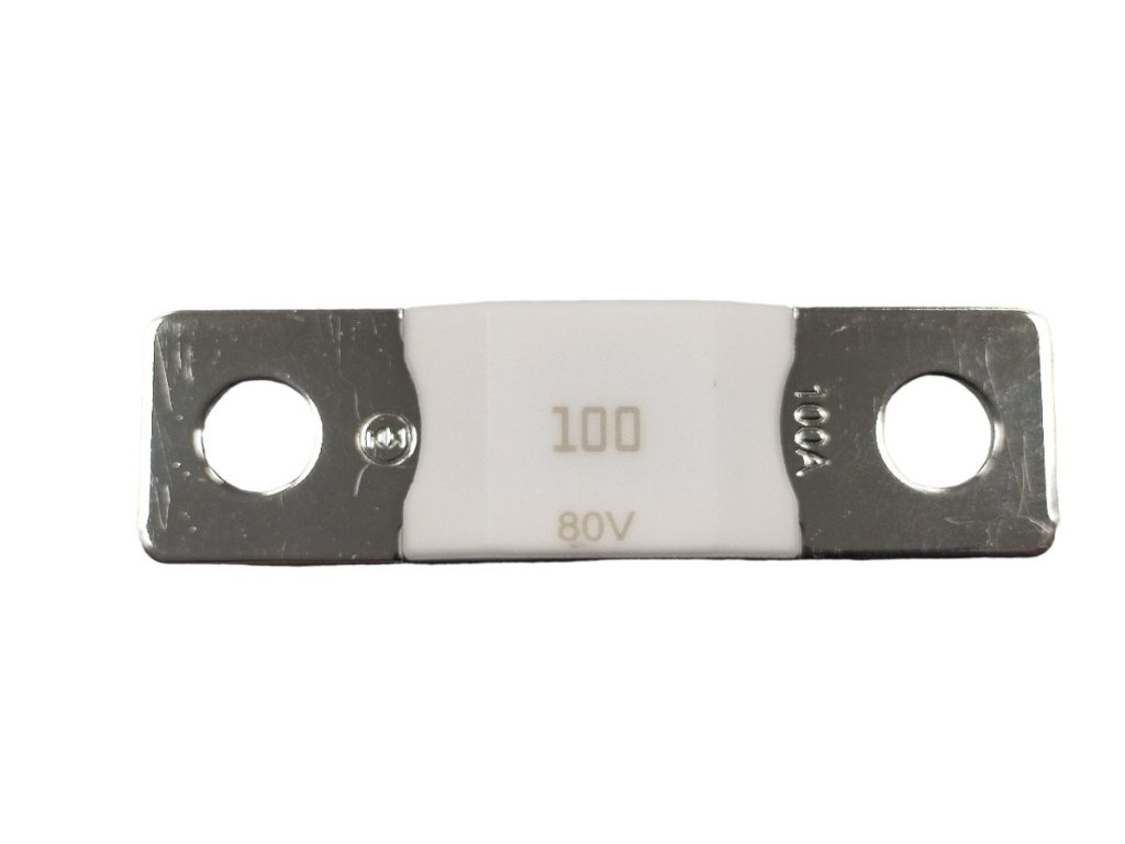 Tavná MEGA pojistka 100A / 80V pro 48V produkty. Keramické pouzdro těla pojistky pro větší bezpečnost. Rozměry ca: 68 x 16 mmRozteč děr: 50,8 mmPrůměr děr: 8,64 mm (na M8)