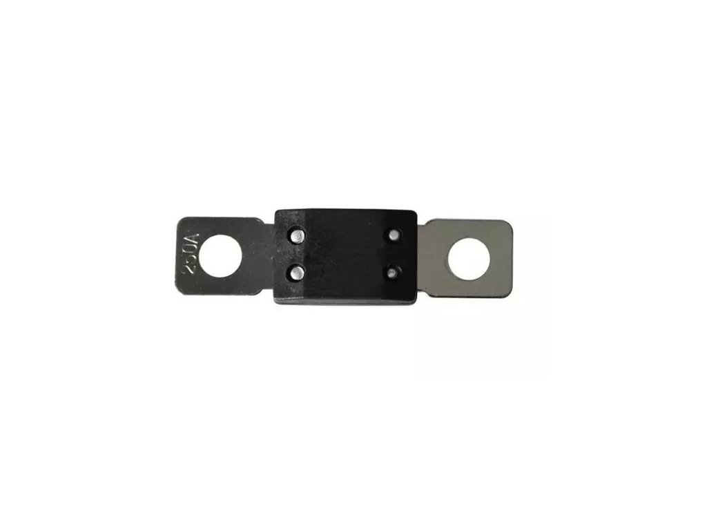 Tavná MEGA pojistka 250A/32V. Rozměry ca: 68 x 16 mmRozteč děr: 50,8 mmPrůměr děr: 8,64 mm (na M8)