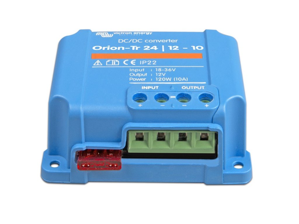 DC/DC měnič napětí z 24VDC na 12VDC 15A (180W) Victron Energy se zárukou 5 let. Neizolovaný (společný mínus). Měnič se vyznačuje vysokou účinností až 97% při plném výkonu. Krytí IP43 pokud je instalován se šroubovými vývody směrem dolů. Připojení je šroubovou svorkovnicí - není třeba speciálního nářadí. Specifikace měničů Orion-Tr PARAMETRYVstupní napětí: 18-35 VdcVýstupní napětí: 12,5 VdcÚčinnost: 97%Výstupní proud: 15AMaximální krátkodobý výstupní proud: 20AGalvanicky izolováno: NeOdběr naprázdno: <0,035 APracovní teplota: -20 až +55°C (snížení výkonu 3% na každý 1°C nad 40°C)DC pripojení: šroubové svorky vodič max 6mm2Hmotnost: 0,25 KgRozměry vxšxh mm:73x94x37Standardy: Bezpečnost EN 60950, Emise EN 61000-6-3, EN 55014-1, Imunita EN 61000-6-2, EN 61000-6-1, EN 55014-2, Automotive předpis ECE R10-4