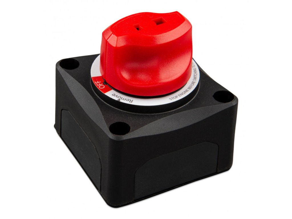 Bateriový odpojovač Battery Switch ON/OFF 275A je vhodný pro bateriové systémy do 48 V. Má jedinečný ergonomický a estetický design knoflíku. Knoflík je odnímatelný z bezpečnostních důvodů nebo za účelem přidání izolace. Bateriový odpojovač lze namontovat na povrch nebo na panel, což poskytuje flexibilitu během instalace. Bateriový odpojovač splňuje normu ISO8846 (ochrana proti vznícení) a je vhodný pro použití ve strojovně. PARAMETRYMaximální trvalý proud: 275 AProud po dobu max 1 minuty: 455 ARozběhový proud: 1250 A maxVývody: M10Napětí: 48 V DCRozměry: 69,5 x 76,3 x 69,5 mm